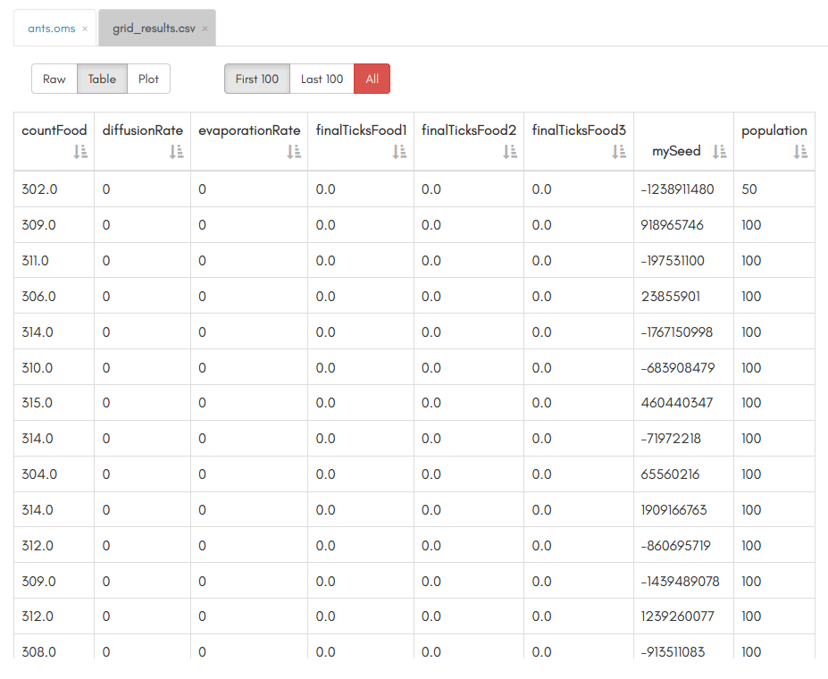 A stochastic model ran several times with the same parameter set will give different outputs. It is the case of the Ants model we used in the previous tutorial. In order to repeat easily a model execution and concatenate the results, OpenMOLE provides the Replication task.