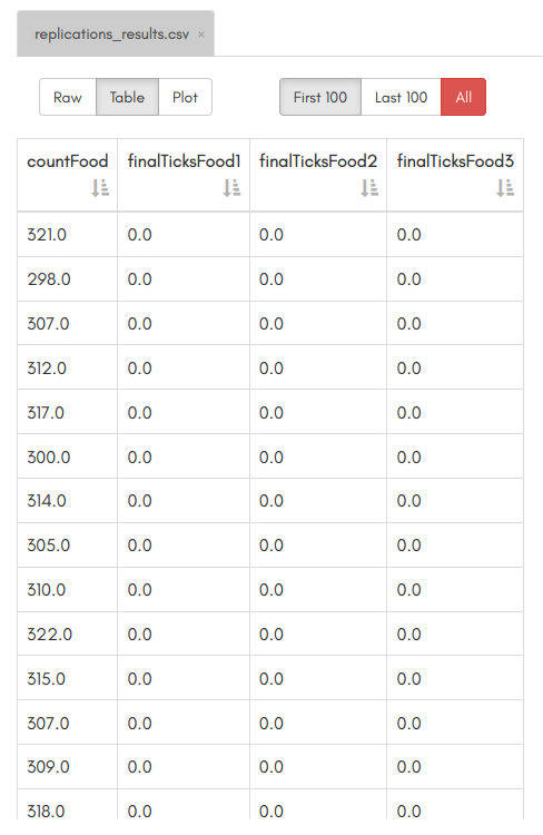 Once the execution is over, refresh your workspace by clicking on the second-to-last icon on the left of the GUI (circle with two arrows). A new file will appear named replications_results.omr, this is the file that our workflow created, containing the replication results! You can click on it. You won't have the same numbers as above, since the random seed won't be the same. However, you should have the same column names and 100 lines of results: one for each model execution.