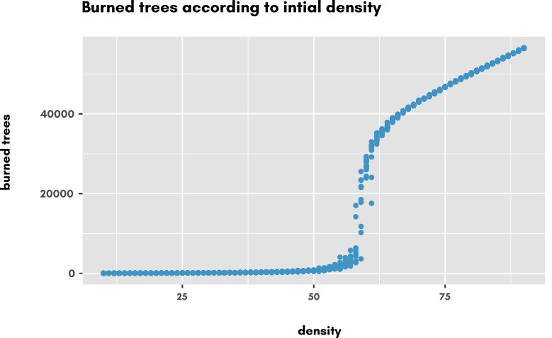 This is the resulting scatterplot of the number of burned trees according to density varying from 20% to 80% by 1% steps.