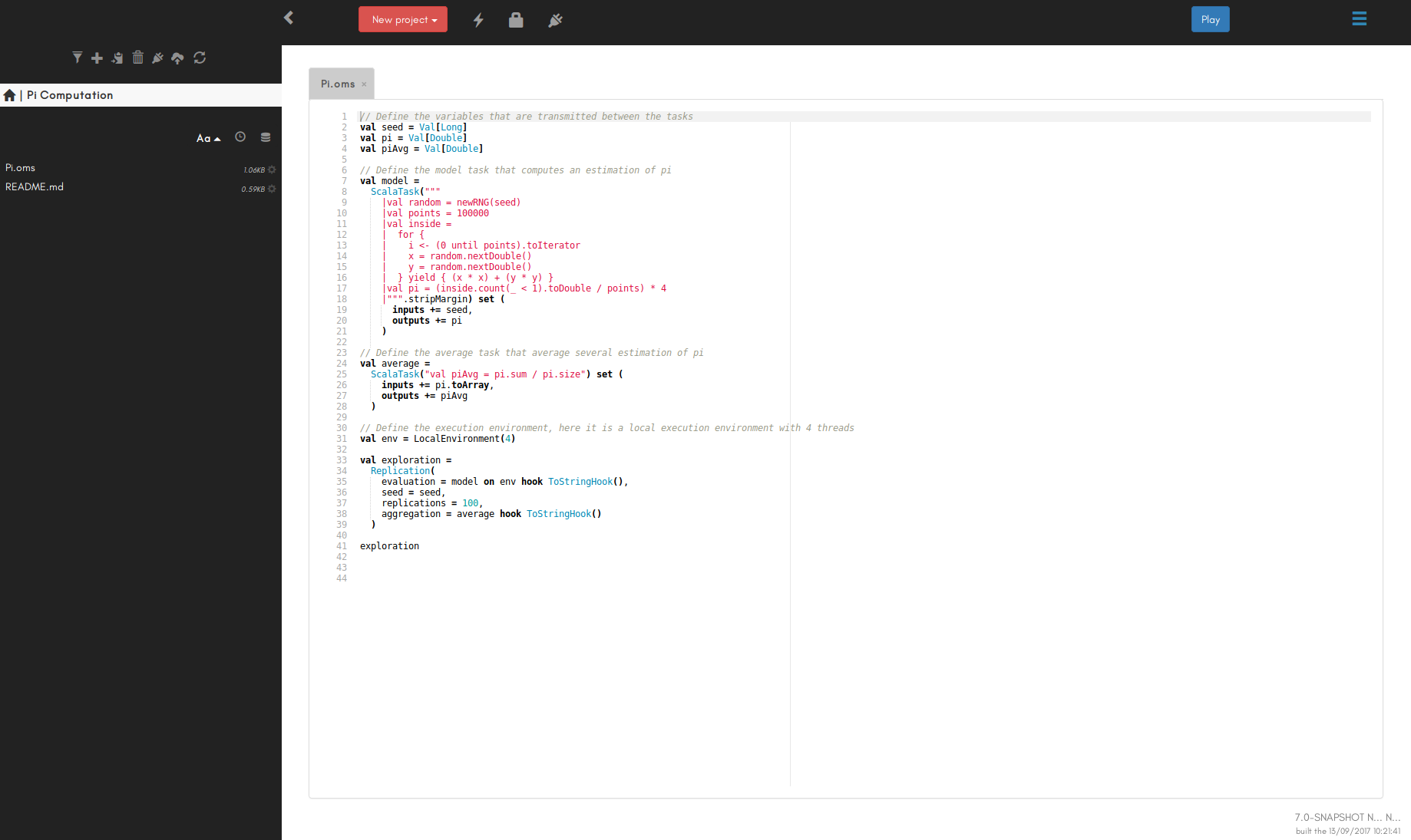 Before downloading OpenMOLE, you might want to get a preview of what you can do with it. You can try OpenMOLE online using our demo website. Please note that the service hosted on a slow machine and is reset every 6 hours, so don't be surprised if it is a bit slow or if your script suddenly vanishes :-)Install OpenMOLE 🔗