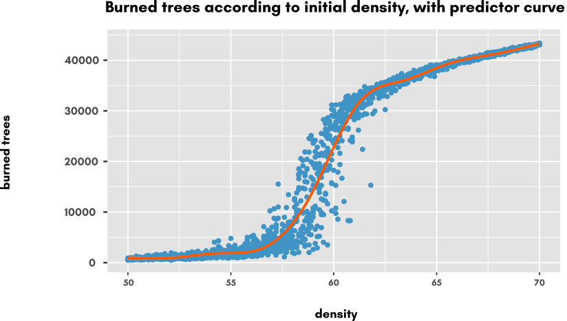ggtitle("Burned trees according to initial Density, with predictor curve and booxplots")+