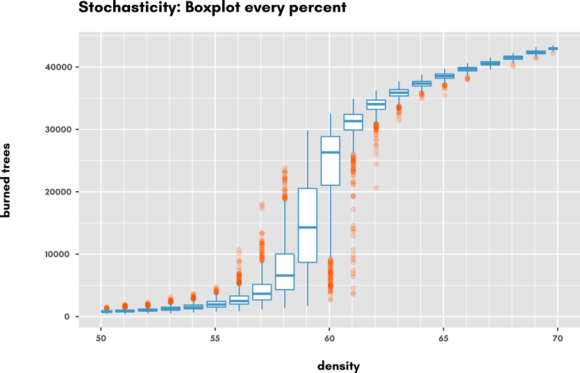 We obtain the following results, displayed as boxplots every percent (but results are obtained for every 0.1% density) to emphasize the variations. As we can see, stochasticity has a huge effect right in the middle of the transition of regime, reaching its maximum at 59%. Another interesting thing to investigate would be the density from which the fire propagates to the end of the zone (right side of NetLogo World). A slight modification of the model code would do the trick, hint: @code{any? patches with-max [pxcor] ...} would be a good starting point :-) but we let you do it on your own (any successful attempts would win the right to be displayed right here!).