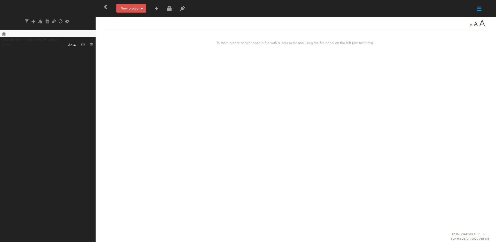 After downloading OpenMOLE, launch it by executing the openmole file in the installation directory with the ./openmole command in a terminal. Once OpenMOLE is up and running in your browser, you should see the GUI: