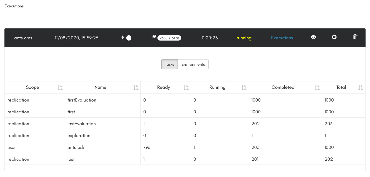 To execute a workflow you just need to have the oms script open in the GUI and click on the "Run" button. The execution panel will then open for you to monitor the execution, as shown below: