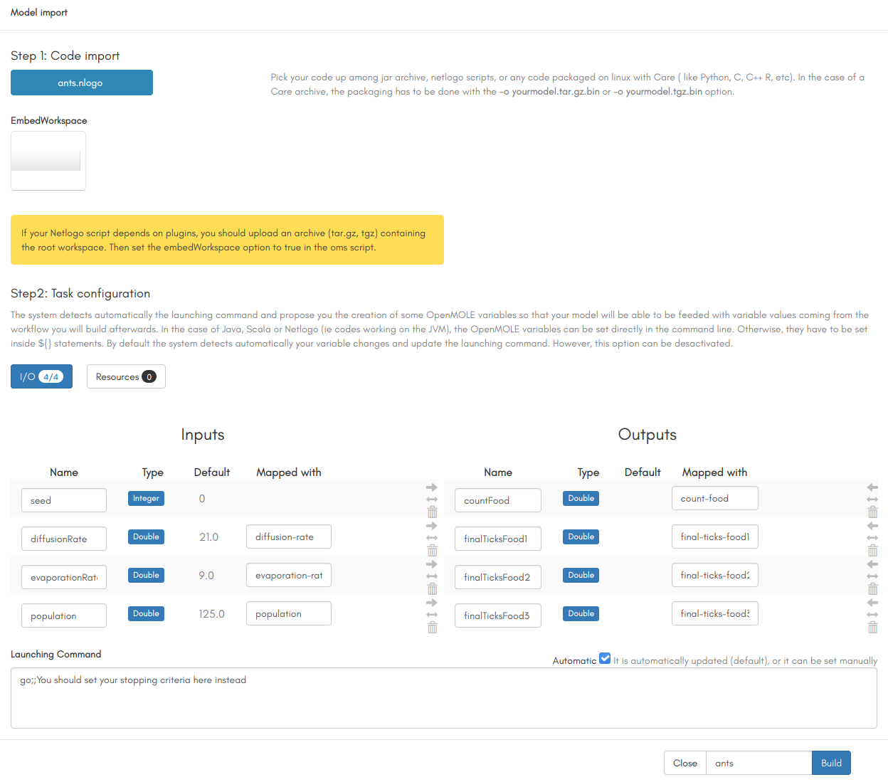 Based on the automatically detected parameters and NetLogo commands, the model wizard creates an OpenMOLE script containing variables for the inputs and outputs, and a basic workflow to run your model. If you didn't use the model wizard to import the Ants model, you will need to write a workflow to execute it, similar to the one generated by the wizard and containing all the basics. The .oms script generated for the Ants model is shown here: